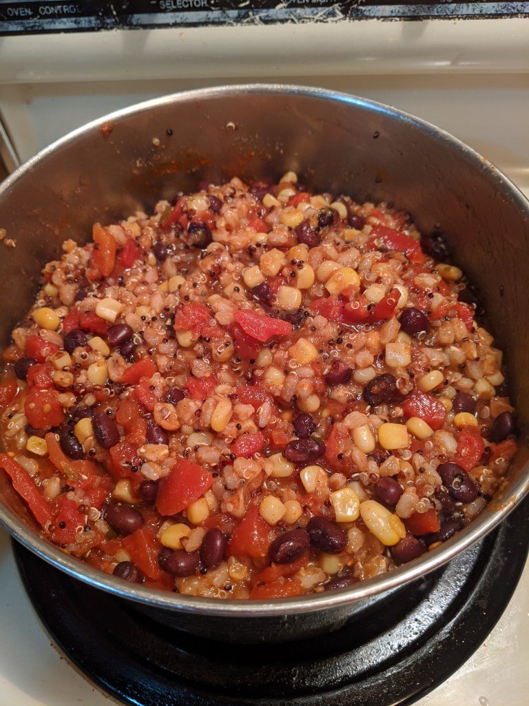 - Combine all ingredients (Quinoa, rice, farro, diced tomato (both cans), black beans, corn, and 3/4 of the container of vegetable stock) in medium-to-large sauce pan/pot and set to medium heat.