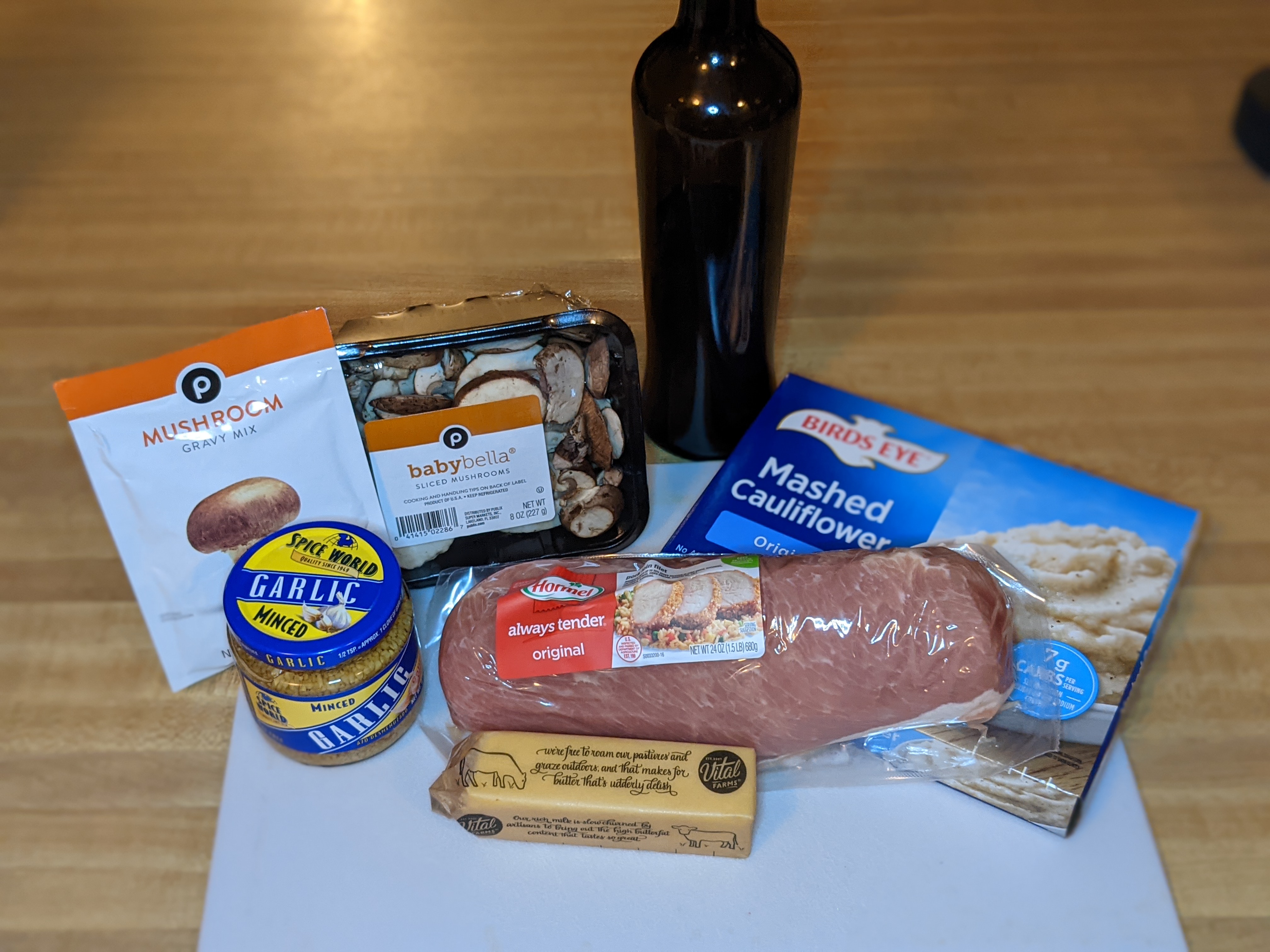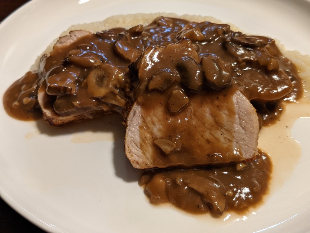 - Artfully spoon mushroom gravy sauce over pork and mashed cauliflower.
