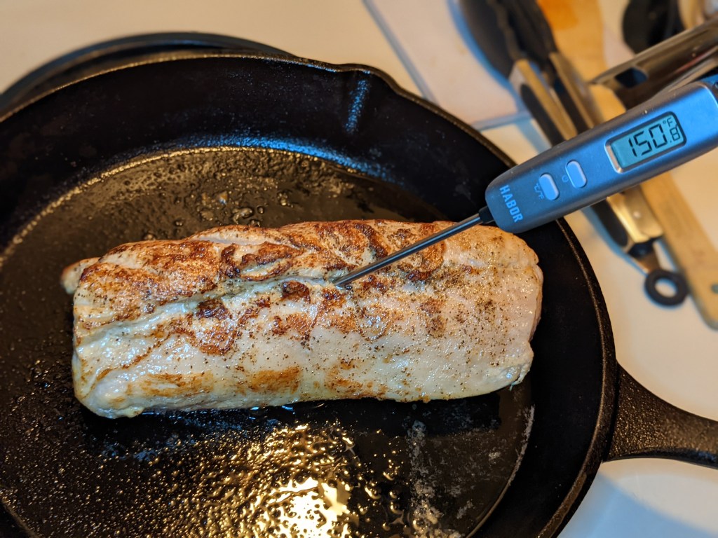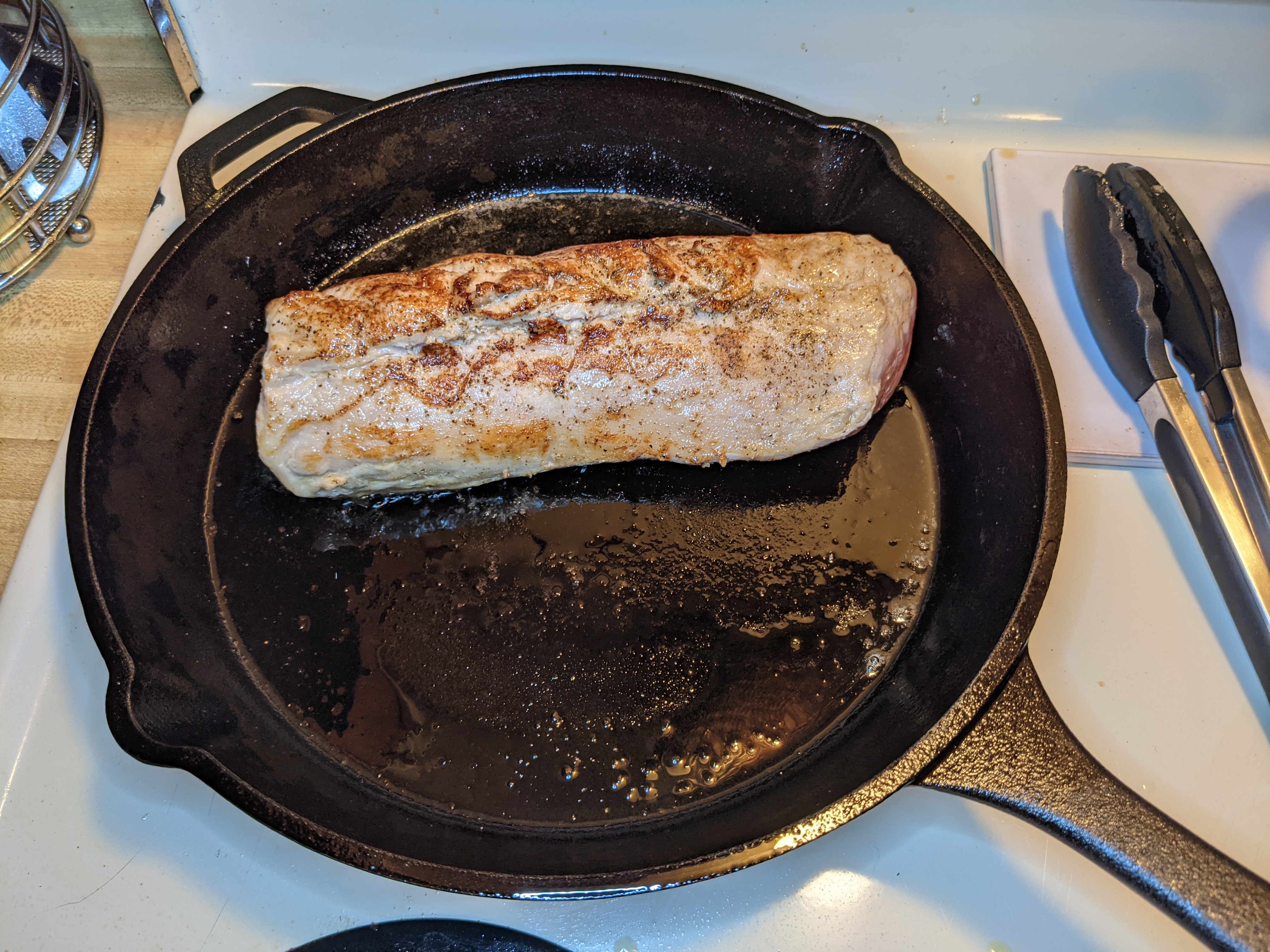 - Add pre-seasoned pork loin to skillet. Allow ~3-5 minutes to sear on each side (until nicely browned).